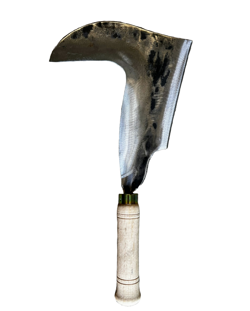 Hier ist eine zweischneidige Sichel zum Roden und Freischneiden Ihrer Felder und Wälder. Dieses grob geschmiedete Werkzeug besteht aus einer gebogenen Klinge zum Freischneiden und einer geraden Klinge zum Roden.