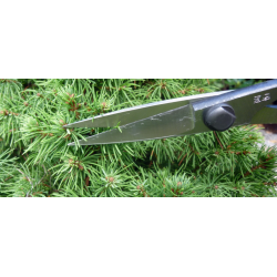 The blade is sharpened at two angles, ensuring a smooth cut through the wood without unnecessarily damaging the plant. With its unique hollow shape at the base, the blade allows sap to flow, and the blades do not spread apart. The V-shaped spring evenly distributes the force along its length, ensuring a smooth closure. These Okatsune 200 scissors are not suitable for cutting small branches; for that, use Okatsune pruning shears 207.
