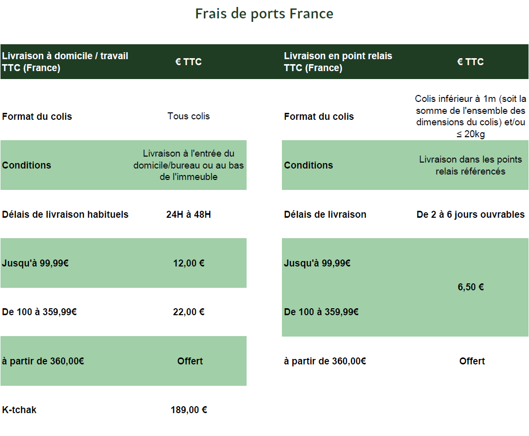 Les frais de port sont automatiquement calculés lors de la validation de votre panier, voici notre grille tarifaire à titre indicatif :